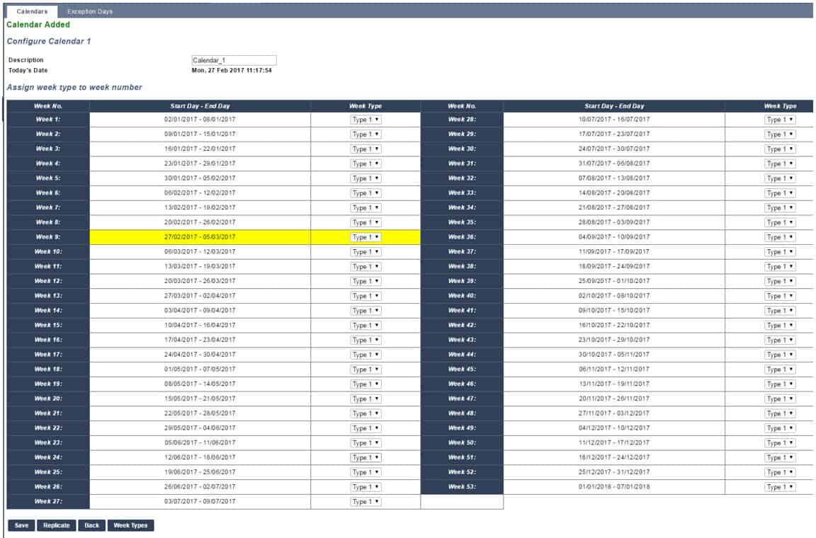 Calendars are configured by assigning an optional Week Type for each calendar week. Up to three Week Types may be defined for each calendar. Not all weeks must have a Week Type (that is, a Week Type may be ‘None’). There is a system maximum number of 64 calendar configurations.