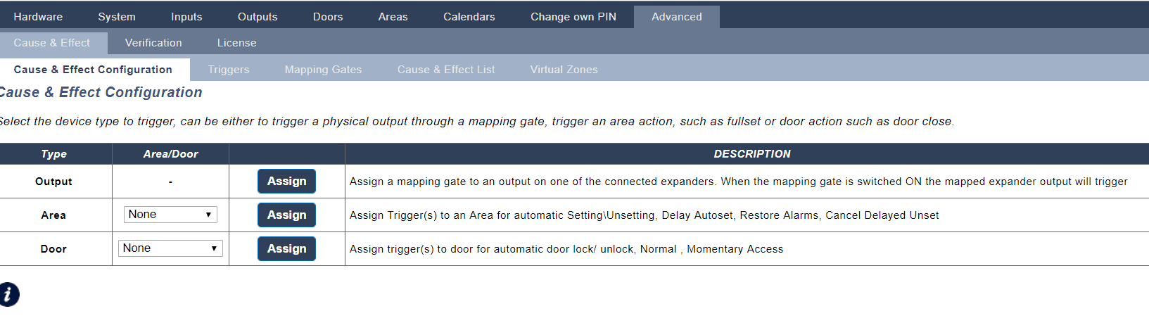 Firstly we must consider what you are trying to achieve, so when something happens you want something to happen. We will first start by defining the conditions this will start the process later we will look at the actions we can take when these conditions are true. Log into the SPC web page and enter configuration mode, select "Configuration" -> "Advanced" - > "Cause and Effect". This menu will highlight the Cause and effect (C&E) logic in the system.