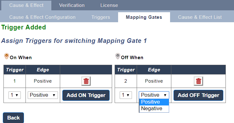 triggers can also be used to control custom defined outputs called "Mapping Gate" these are added in the cause and effect menu the mapping gate has the following attributes