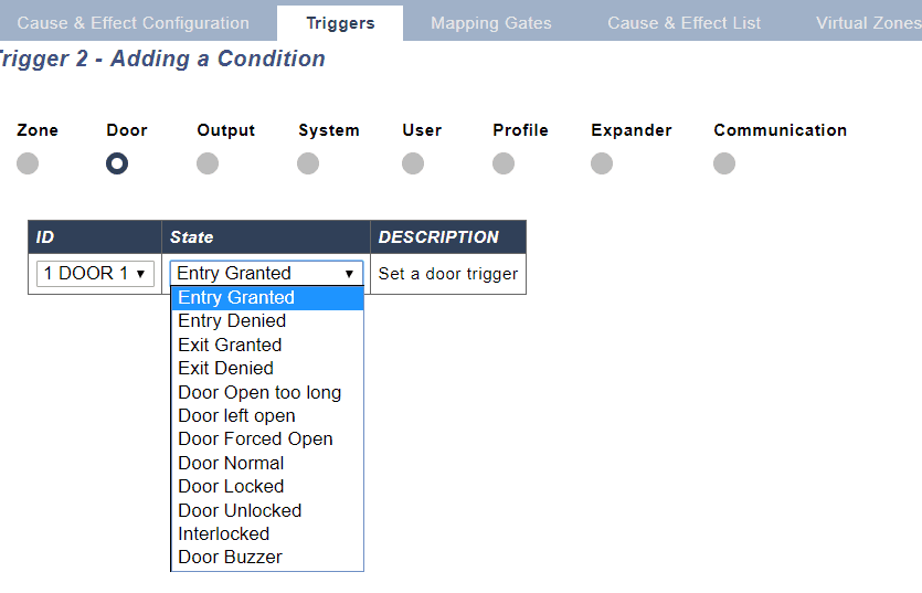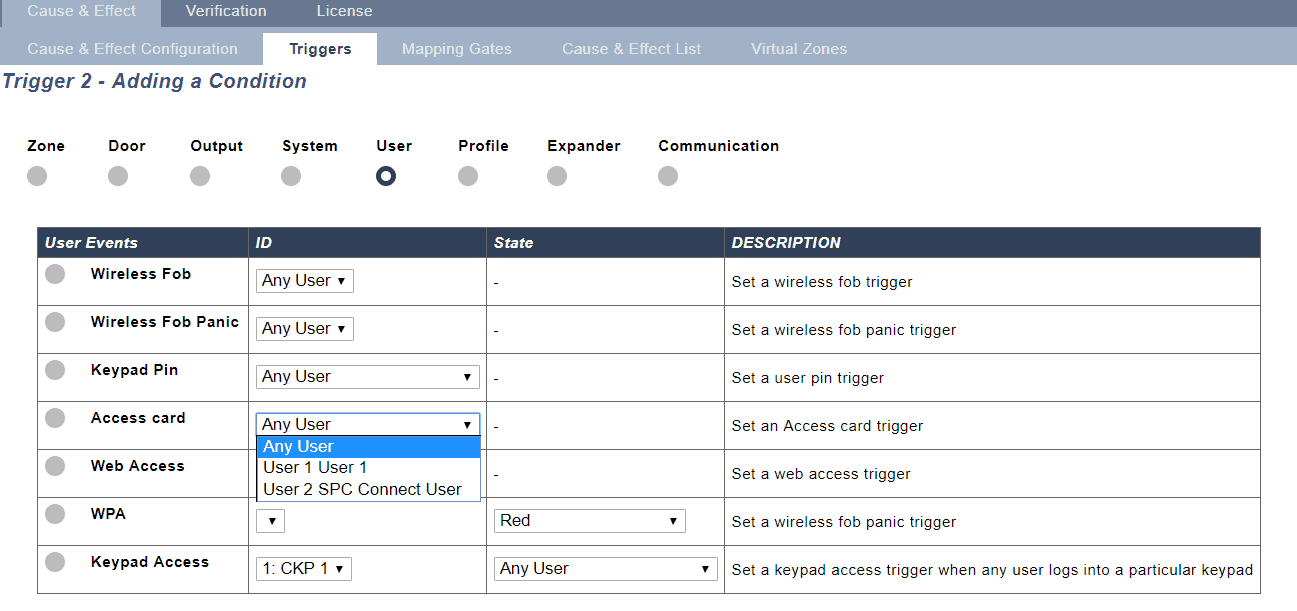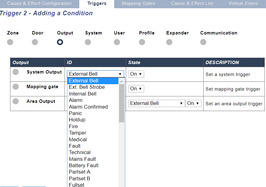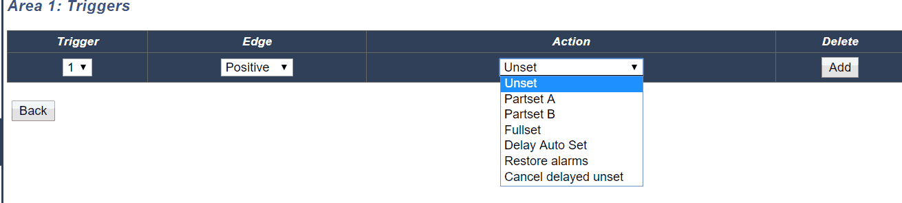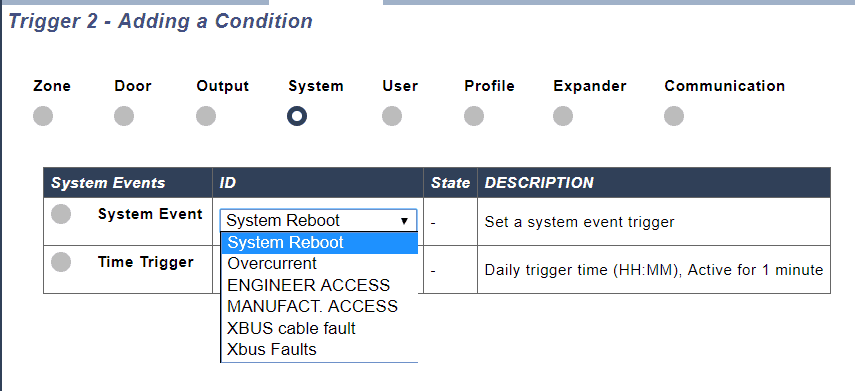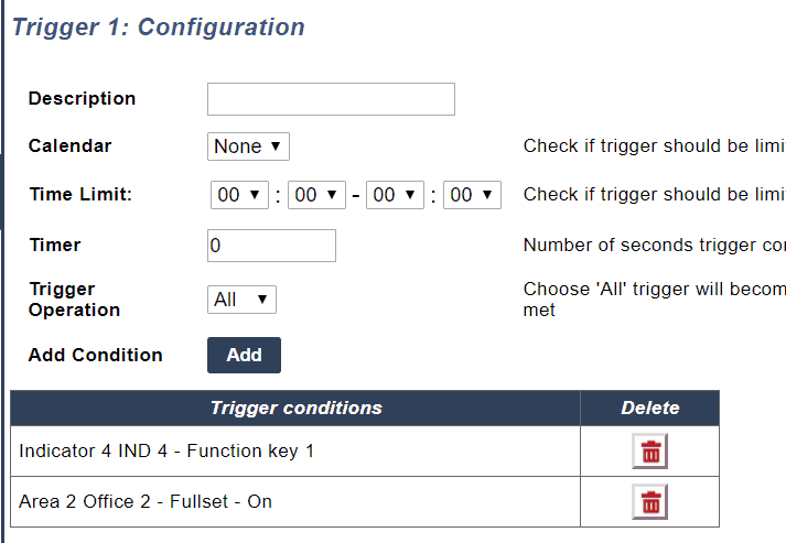 Triggers allow you to define the "When" it will contain the conditions that must be true in order to start the actions you require. You can add a large number of triggers to SPC and the number of triggers is defined by your system type. A list of triggers is available in the SPC web page and from this web page you can also add or edit triggers.
