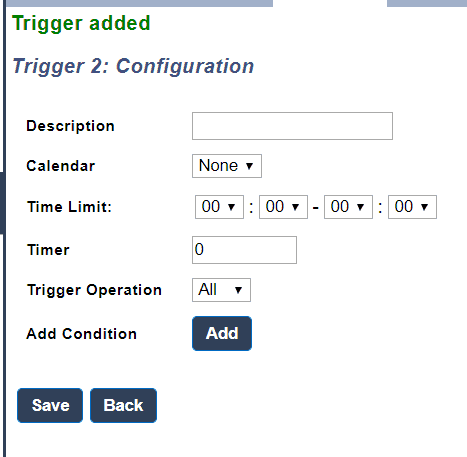 - Timer - The time conditions must be true prior to activate the trigger
