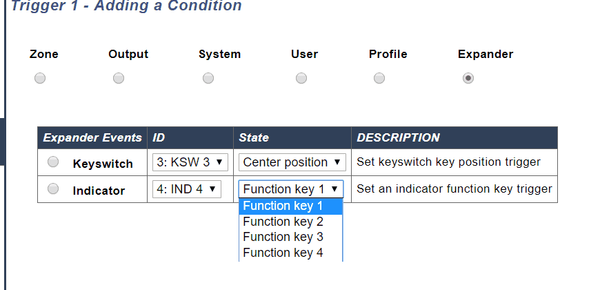 If we wished to perform a function when the function key is press and area 2 is unset we add both conditions to the trigger conditions.