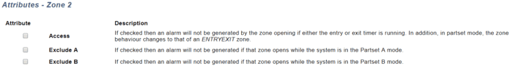 If the ‘Exclude A’ attribute on a zone is set, then an alarm will not be generated by that zone opening while the panel is in the Partset A mode. The ‘Exclude A’ attribute is valid for Alarm zone type and Entry/Exit zones only. A FULL alarm is generated if a zone with the EXCLUDE A attribute is opened while the system is in FULLSET or PARTSET B Mode (Bells - Internal and External, Strobe).