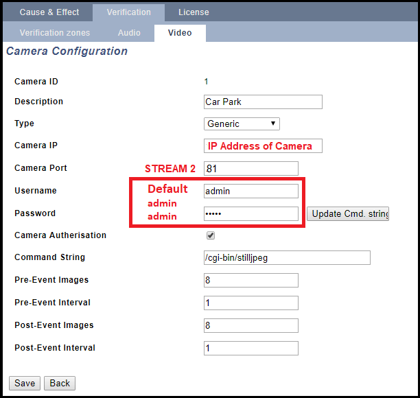 To add a Vanderbilt camera to an SPC panel using Stream 2, go to Configuration > Advanced > Verification >Video > Add. (Port 81 is Stream 2 on the Vanderbilt camera.)