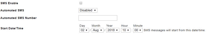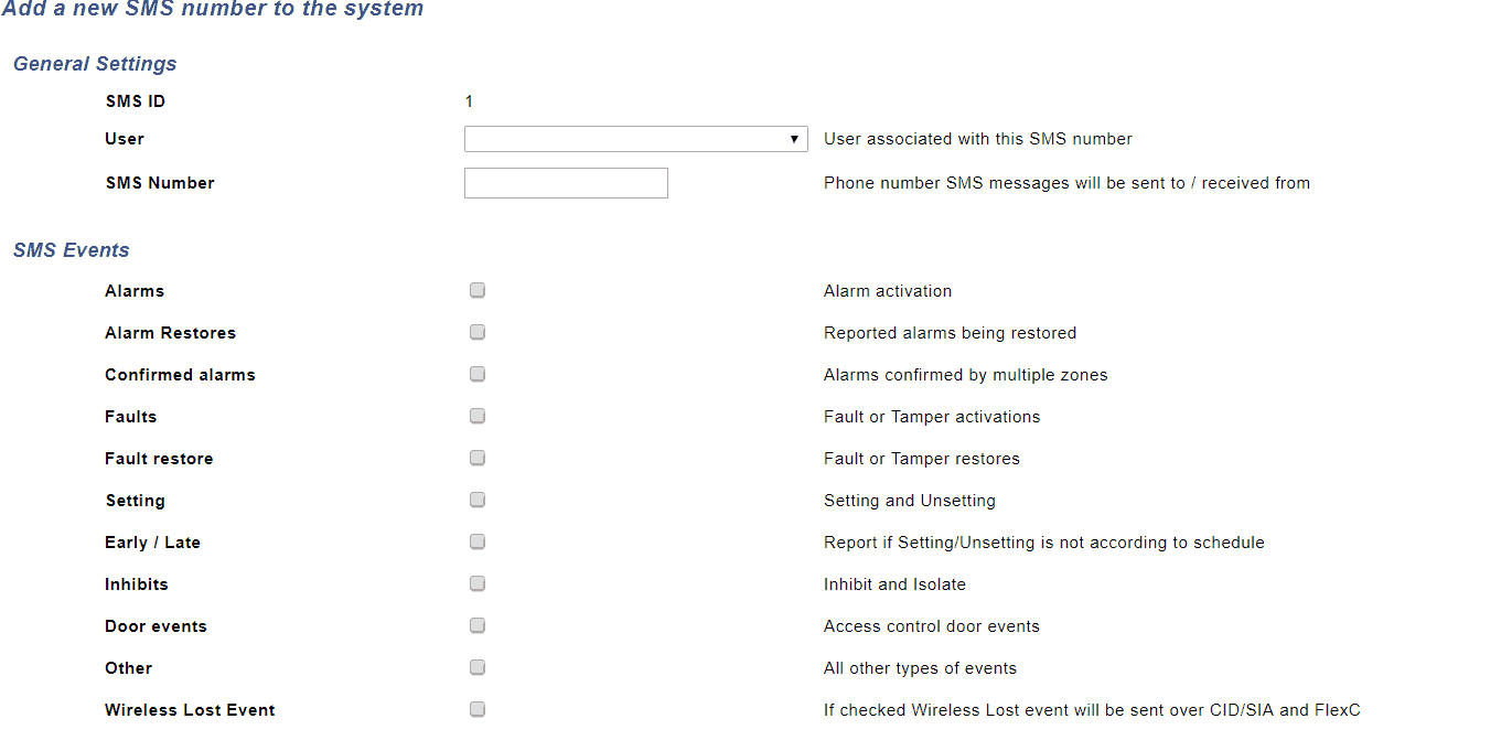 The SMS notification can be set up to send a range of events that occur on the system such as: