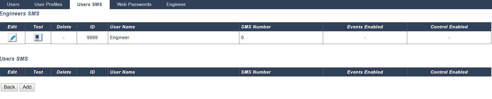 When step 1 is complete a new menu item will appear on the web page and keypad called SMS, Select the menu, this will give an overview of all the SMS configured on the system.