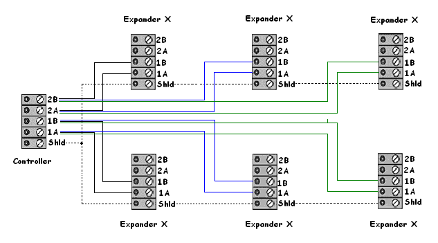The wiring continues with connection 1A, 1B to 2A, 2B on the next Expander and so on to the last Keypad or Expander.