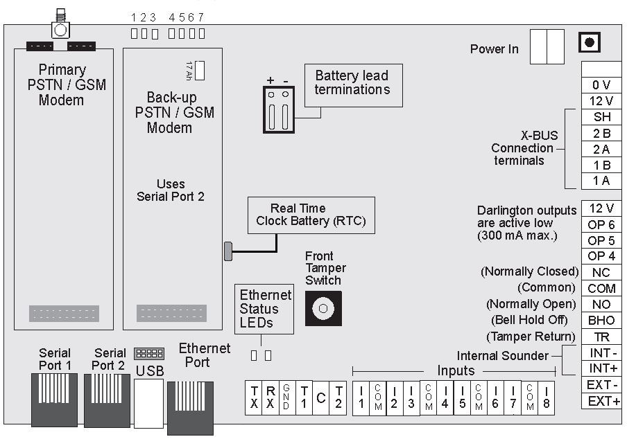 The multi-drop wiring configuration requires that, only the last Expander or Keypad connected on the longest XBUS length of cabling should remain fitted with a jumper. This jumper acts as a resisting terminator cancelling echoes on the line. Ensure that all other termination jumpers are Removed from the remaining Expanders.