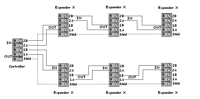 On a 5000 or 6000 Controller, there are two ports, 1A/1B, 2A/2B, however only one channel, 1A/1B, is to be used on each Expander. This configuration can support a maximum of 16 expanders (eight per BUS) with a maximum cable length of 200 metres. (100M on a 4000 and 200M on a 5000 or 6000 series panel).