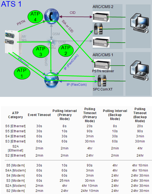 - The ATS describes the main path and backup paths (reporting strategy) used to report events to an alarm organization. Examples: