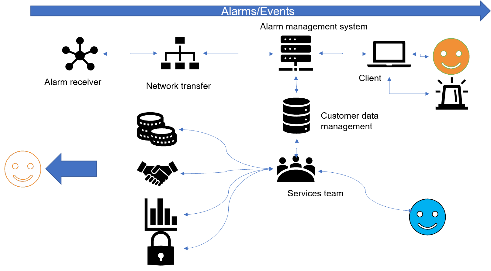 - This will be passed to the alarm management system, this is a key system in alarm management which will sync information with the customer database and manage the lifecycle of the alarm.