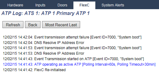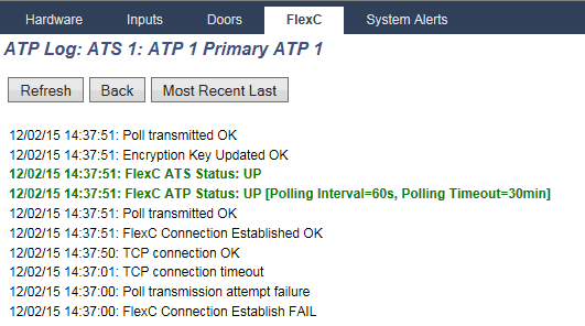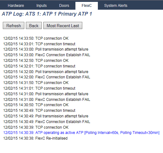 The first step is to view the APT log for the ATS connection. This can be found on the system status page under the FlexC tab. Click on the ATP log button on the bottom right.