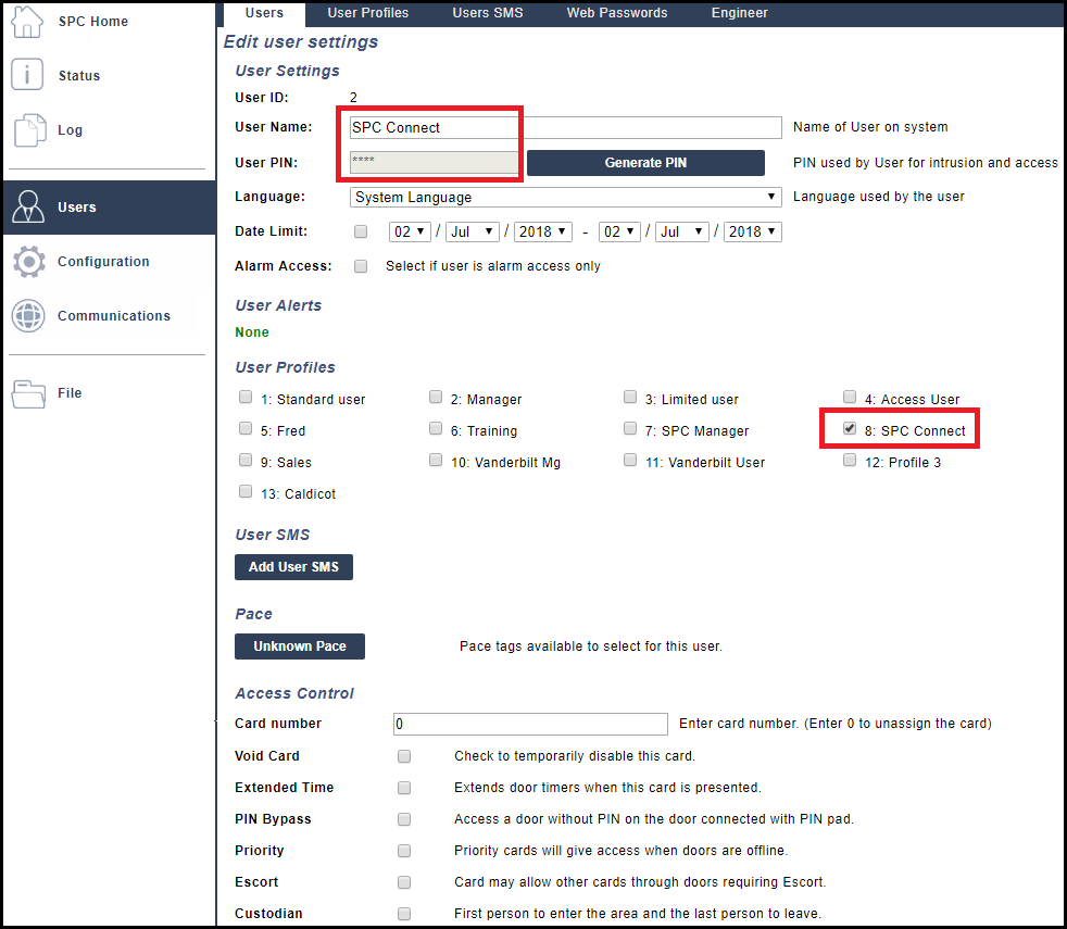Make a note of the User Name ( Vanderbilt ) and User PIN ( 1234 ) as this will be required later when registering a Panel to your Account on the SPC Connect portal.