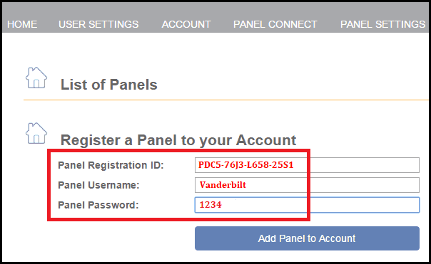 Login and Register the panel to your account using the information saved earlier from the panel setup - Panel ID, User Name & User Pin.