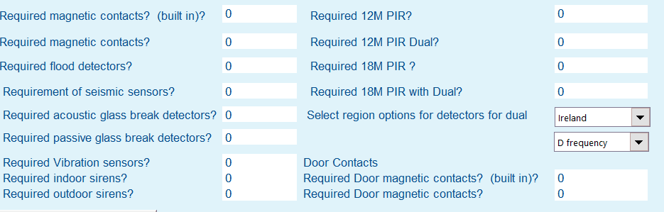 There are four fields for magnetic contacts for general expanders you can add flush (built in) magnet contacts or standard magnet contacts, you have the same options for the doors, these are separated so that the number of expanders and door controllers can be calculated correctly, the flush mount will add MK-2400-6 Magn. Cont.,6m, G2, alternatively the MK-2400-S1 contact will be added.